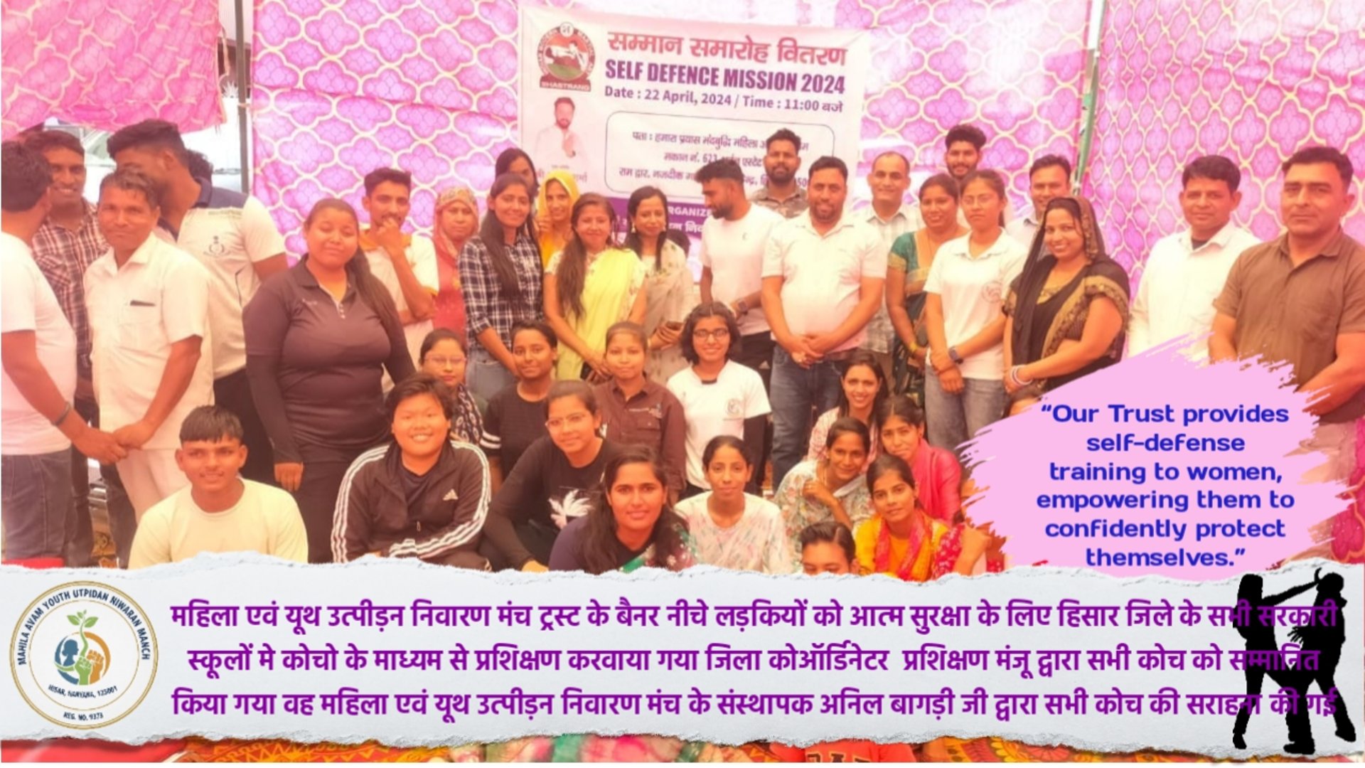 Our trust conducts self-defence awareness programs to help women and girls learn safety skills and build confidence. These sessions focus on practical techniques, awareness, and empowering them to protect themselves.